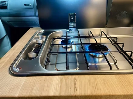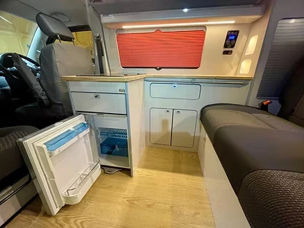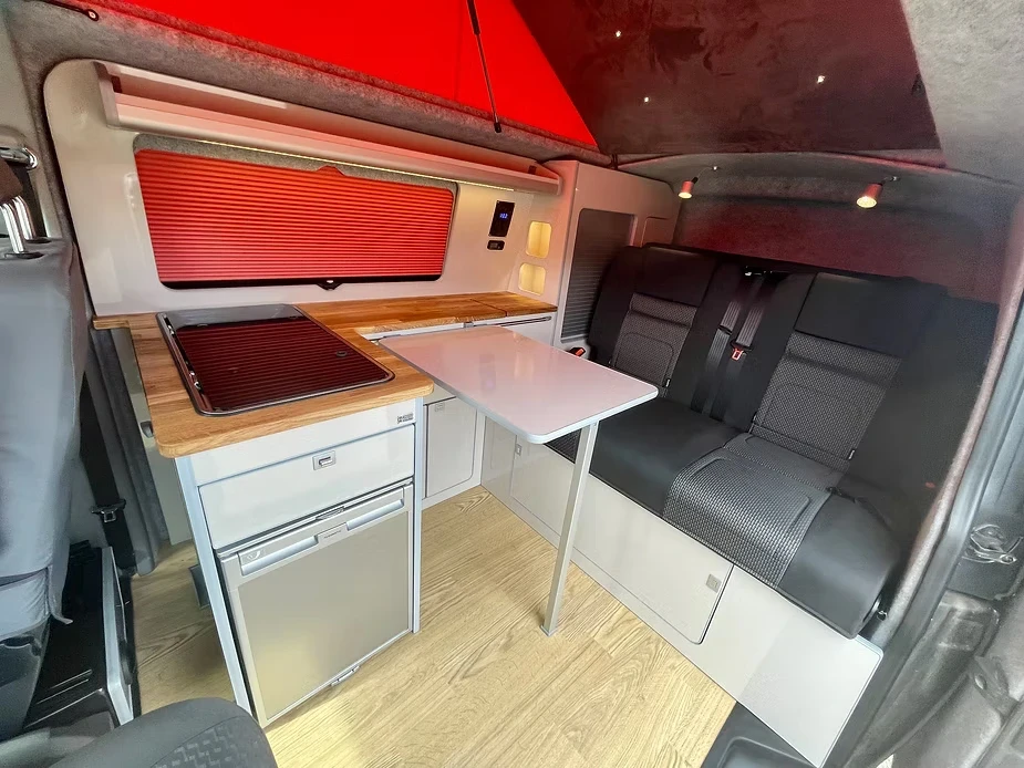 You can see a big splash of colour provided by the orange tent selected as part of the elevating roof system. The fun continues into the rear cab space with the addition of "flame" window pods by Vanshades. Because much of the touring in JJ will be on the Continent, we added a mesh fly screen option for the blinds. No doubt these will be appreciated when keeping the van cool but mosquitos out.