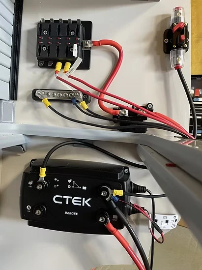 Here's the 12v system in the early stages of being hand wired. The CTEK battery management unit will be hidden below a removable panel. The fuse box above remains more easily accessible in the cupboard above.