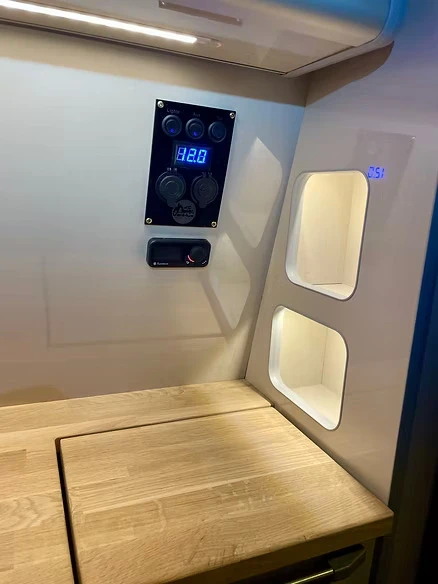 The super-simple control panel is all the customer needs to monitor battery health, arm the water pump, switch on the under shelf lights and power up the auxilliary sockets (USB and cigar lighter).